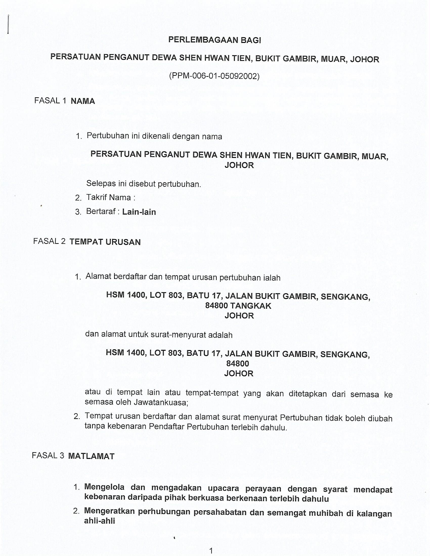 PERSATUAN PENGANUT DEWA SHEN HWAN TIEN BUKIT GAMBIR CONSTITUTION